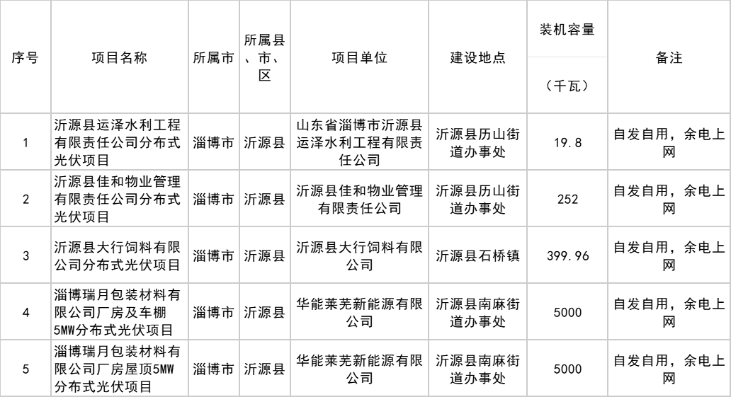 沂源縣2024年度第二批無補貼平價上網光伏發電項目信息表